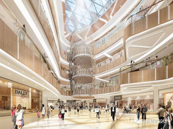 南侧增加展示塔,增加社交休闲及商业展示空间。设计团队意在有限的公共空间之内创造更多人性化的体验空间和朋友家人相聚的社交空间。丰富商业空间层次。主入口南中庭挑台既是中庭的视觉焦点,也是社区生活的垂直社交平台,同时可承载小型商业展示功能,DCI打造特色空间造型并尽量保证中庭空间的通透性。