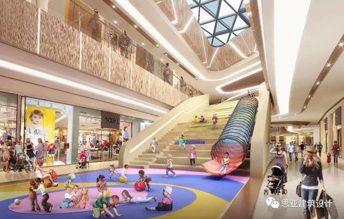 原长中庭空间增加儿童主题阶梯平台,增加上四层的儿童主题阶梯,意在打造一个社区家庭的聚集空间,儿童游乐、演艺空间。